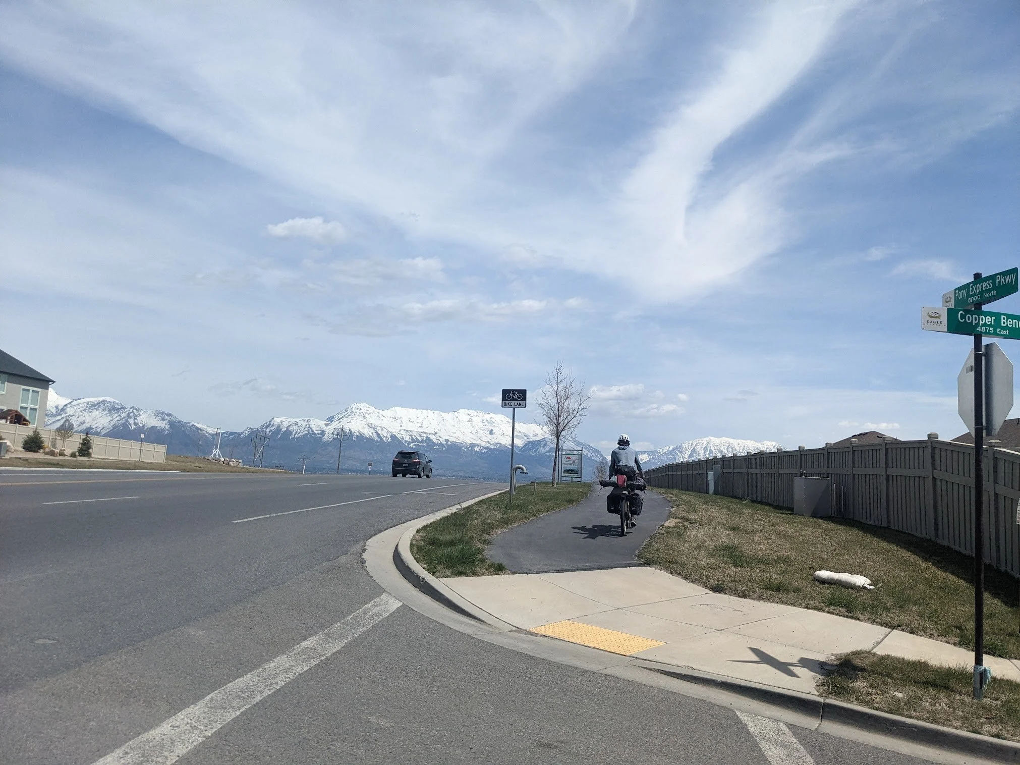 Rolling back to familiar peaksOur final day started similar to all the rest- just pedaling heavy bikes through the Great Basin desert. Familiar peaks started popping up in the distance with a little less snow than when we last saw them. Still a shocking amount of snow for May. We stopped and got burritos in Eagle Mountain, taking them to go for the train ride back to Salt Lake. On the Jordan River Trail, a man on a road bike rolled next to us, looked our rigs up and down, and stated that it would have been cooler if we weren’t on e-bikes before he pedaled out of sight. It was good to see fellow cyclists again.