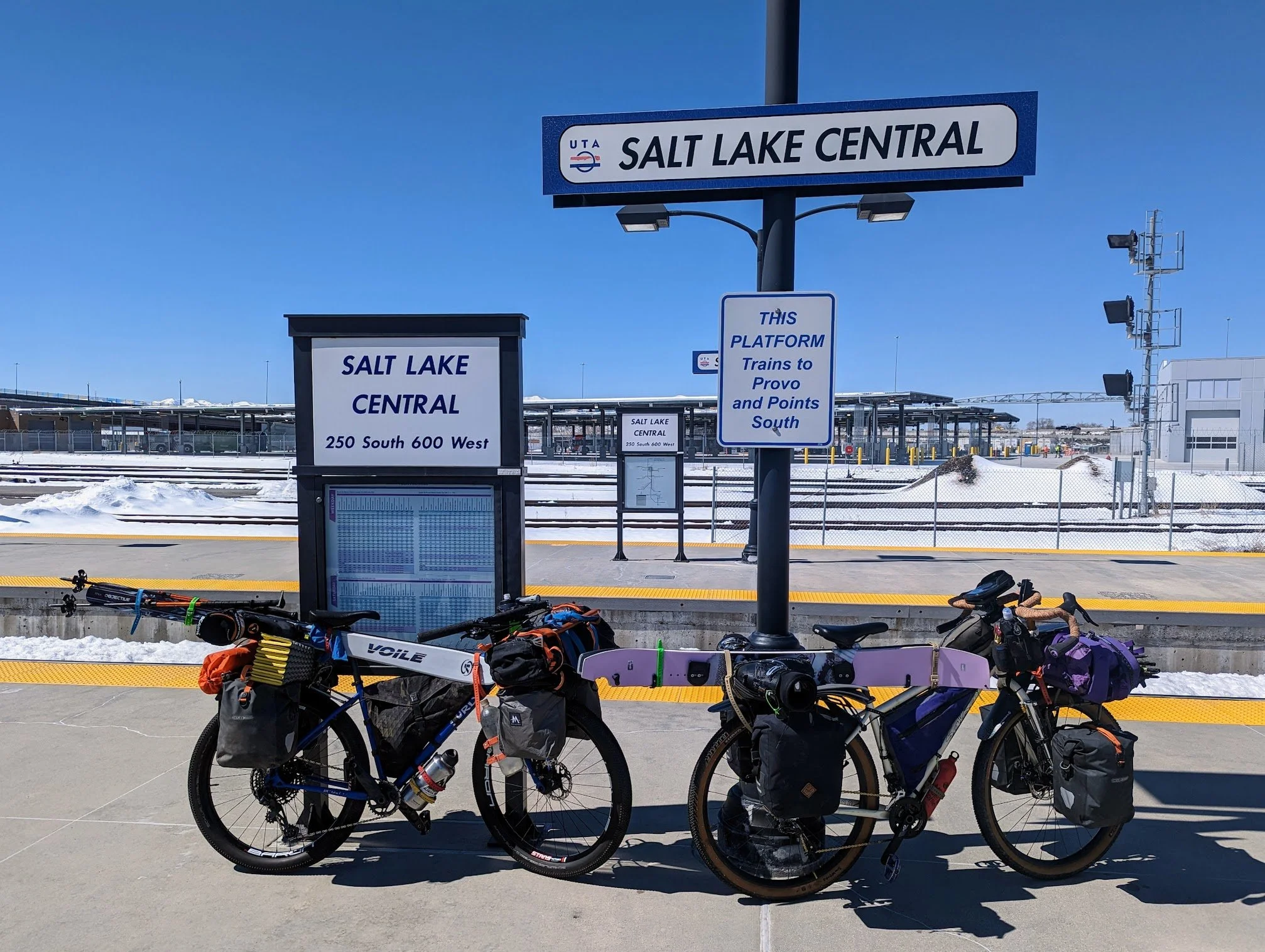 Headed wayyy out there, via Simpson Springs CGWith our jobs on hold, our goodbyes said, and bikes packed, all we had to do was wait for one more April snowstorm to fall and melt enough to ride our bikes out of this salty town. We first realized how heavy our bikes were as we swerved patches of snow on the Sugarhouse Park bike path as we left our house and headed downtown to catch a Frontrunner train to Lehi and really begin the long pedal. Riding that train would be the fastest we moved for another month or so.