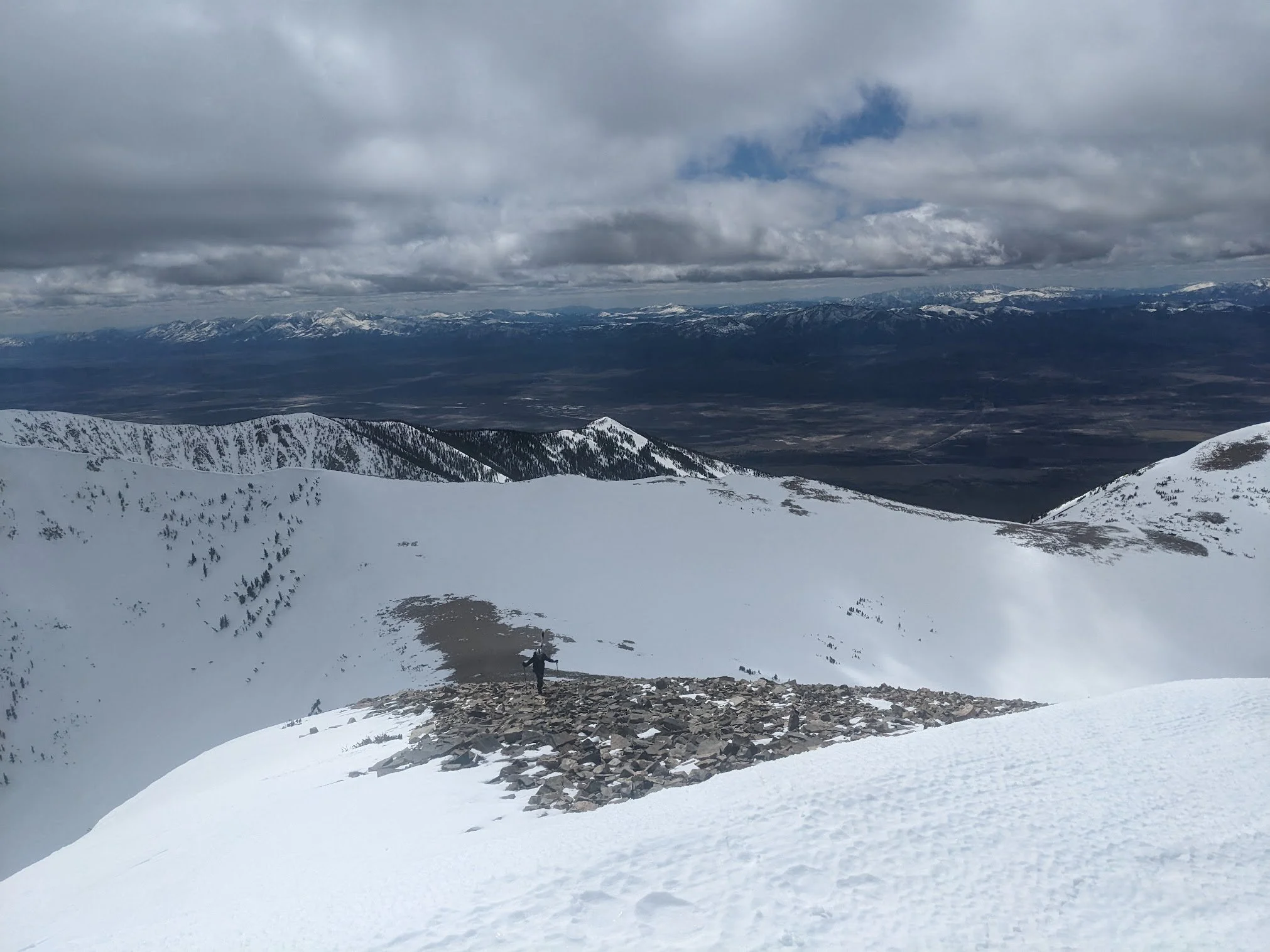 Ian on top of a record snow pack between Red Mountain and Ibapah PeakIt turned out that a leisurely 9 a.m. start was not enough time to summit these mountains that were rapidly melting during a spring heat wave. Between a few subpar navigation decisions (always take the beaten path, not the overgrown road) and a late start, we were caught in full meltdown mode before we even got above the tree line. While we were not yet in avalanche terrain, the snowpack was collapsing beneath our feet on our ascent. The snow had not yet consolidated into a real spring snowpack, and the rapid warming caused the snow to become so saturated that we could posthole to our hips, even with our skis on. We turned around just after noon as roller balls started forming on the steeper slopes ahead, doing our best to not break our legs in the crumbling snowpack on our way out. I forget which one of us said it, but if we were going to ski these mountains successfully tomorrow, we were going to have to “go hardo”, and wake up early and move fast to beat the meltdown. So that’s what we did. We enjoyed a cold plunge in the raging creek next to our camp and prepared for a more diligent mission the following day.