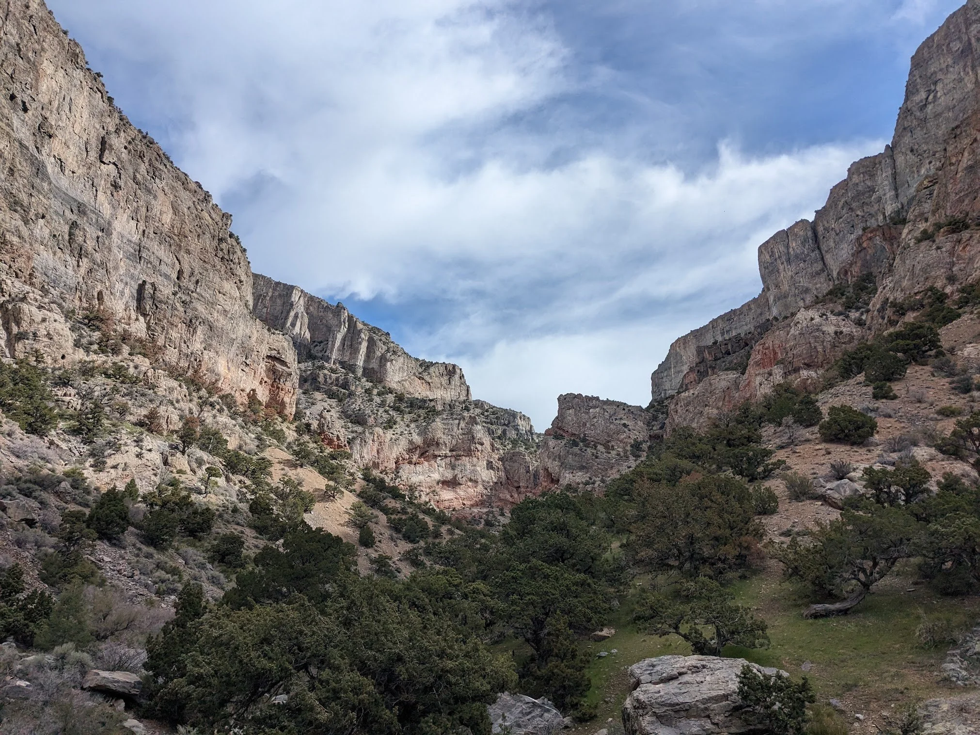 Overall, North Shell Peak wasn’t as technical as Red Mountain. It was a pleasant ridge walk from the false summit to the peak and provided an awesome viewing opportunity to scope our line. Things were still firm at the top so we took our time dropping in, and then laced 2 beautiful lines right down the face of the tallest peak in the Schells. The snow was variable, as we expected with such varied temperatures leading up to that day. We still had some time before things got too warm, so we climbed out for one more run, heading north from the false summit and back down the drainage we climbed up earlier in the morning. We were gifted with some hoop-and-holler-worthy corn on this run. Finally some snow we were really psyched about. The stoke soon faded as we ollied and jibbed our way over creeks and through the dense foliage of the ravine. My sliding ended in what felt like a toeside Baldy traverse at Snowbird, except 10x longer. I was grateful for my days chasing Ian around that resort and learning how to keep up in that sort of terrain. The splitboard is a wonderful tool when wielded properly.