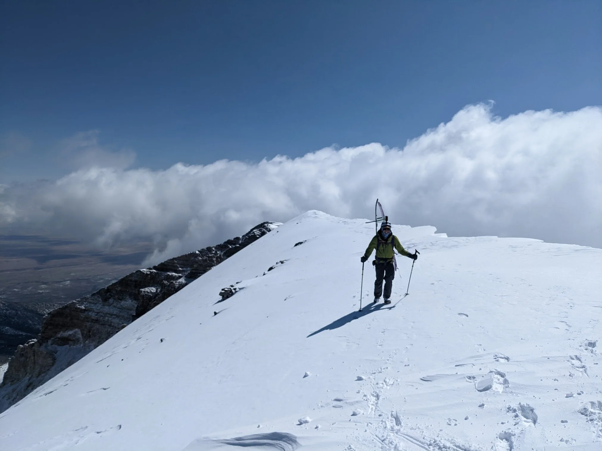 Unbeatable views from the tentThe forecast we received a week earlier in Gandy that called for a chance of snow at upper elevations came through. We woke up to 2 inches of fresh snow. Our boots and everything were completely frozen, so we waited for the sun to shine down before we really started moving. Once we got going along with the day, weather conditions couldn’t have been more ideal. Sunny and cold, maybe just above freezing. Unfortunately, it wasn’t the same for the snow. The new snow provided a nice insulating layer on top of the freeze-melt cycled snow underneath, creating ideal “dust on crust” conditions. We took this into account as we toured up Wheeler. It was a relatively straightforward ascent with ski crampons and boot crampons making appearances when needed, and we reached the summit around noon.